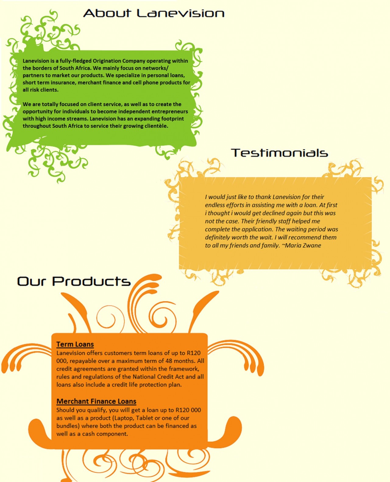 Lanevision is a fully-fledged Origination Company operating within the borders of South Africa. We mainly focus on networks/ partners to market our products. We specialize in personal loans, funeral policies , merchant finance and cell phone products for all risk clients.